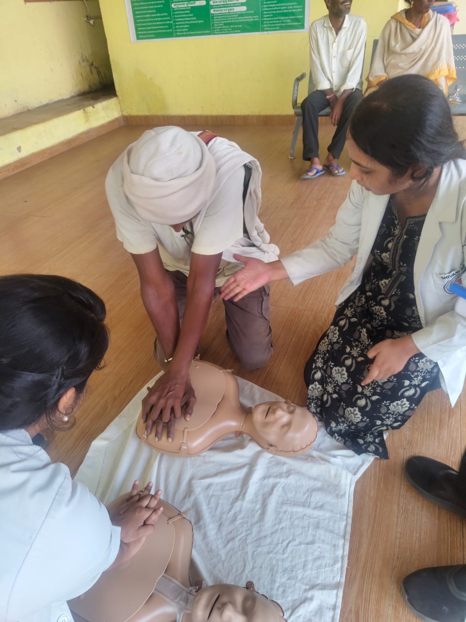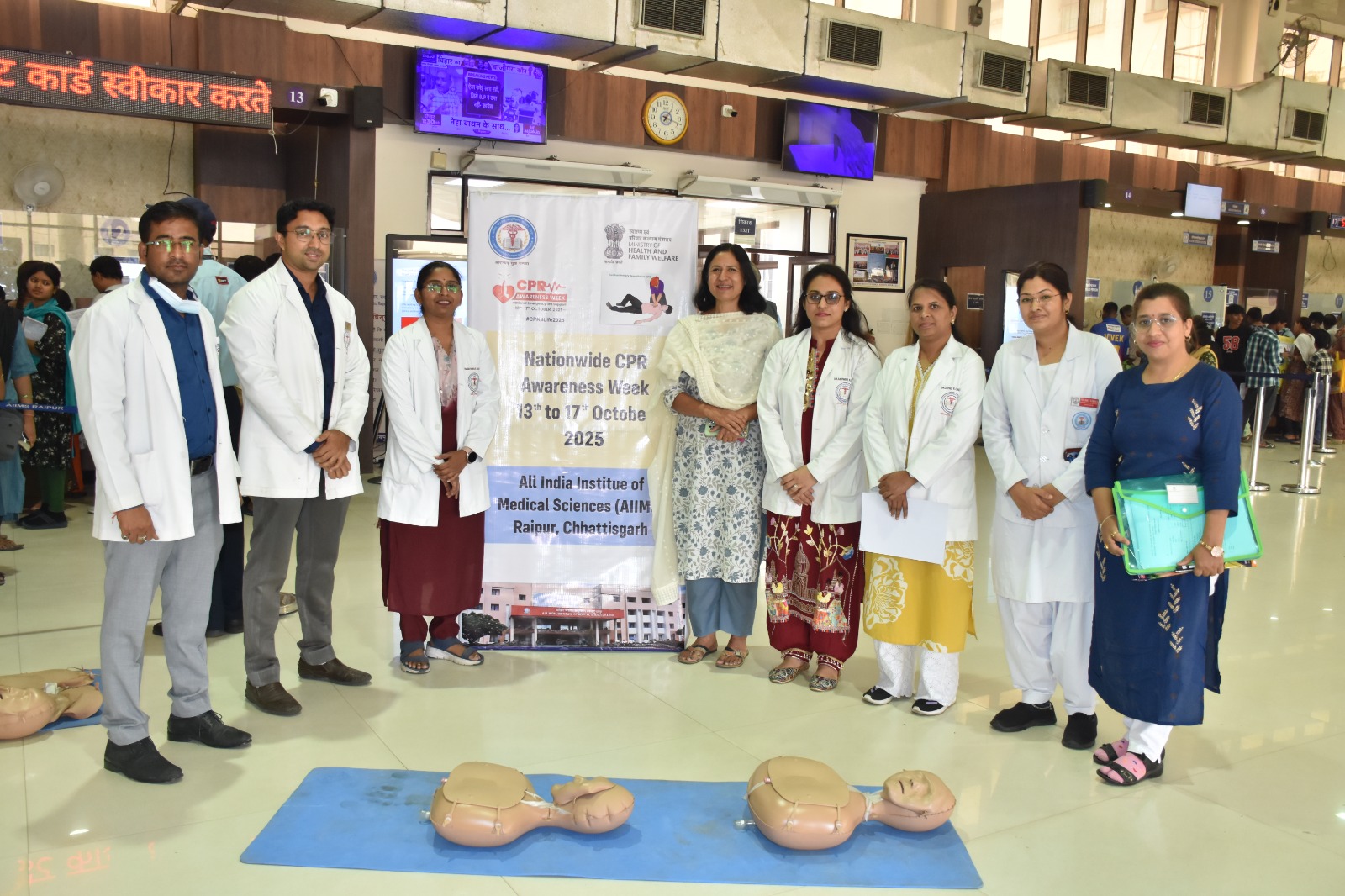 A Nationwide CPR Awareness Week from 13th to 17th October 2025 under the agies of Ministry of Health and Family Welfare was celebrated at AIIMS Raipur with full enthusiasm. Thisincluded a series of activities aimed at sensitization, training and community engagement. We have conducted following activities during this week • A CPR awareness booth was installed at the Registration Central Dome area, AIIMS Hospital for awareness of lay persons visiting OPD. Demonstration videos of Hands-only CPR were displayed on large LED Screen attracted the attention of lay persons visiting OPD throughout the week. Master trainers conducted Hands-Only CPR (HOCPR) training of OPD visitors at this booth. • Second CPR awareness booth was installed at AIIMS OPD screening Area to conduct HOCPR training of community members. People were very much interested to learn Hands-only CPR using Manikins. • Third CPR Awareness Booth was installed at UHTC, Ramnagar Raipur also attracted visitors attention. People learned HOCPR and practice it on Manikins there also. • Fourth CPR Awareness Booth was installed at RHTC, Civil Hospital, Kurud for HOCPR training of OPD visitors in rural set-up. • We organized HOCPR training for medical and nursing students, non-teaching staff as well as school children of Sages Shahid Smarak School, Raipur. • Cumulative number of participants trained in HOCPRthroughout this week was1545,One thousand, five hundred and forty five beneficiaries including OPD visitors,Medical students, Nursing students, Non-teaching staff, and School children. • We did live streaming online Pledge by Secretary, MOHFW on Day-1. Students of First Year MBBS 2025 batch and faculty members took pledge in gracious presence of Dean Academics, Prof (Dr) Eli Mohapatra.Live streaming of Panel discussion organized by MOHFW was done on Day-2. Our Executive Director & CEO, Lt Gen Ashok Jindal graced this occasion. • E-Poster and E-Slogan competition: We have organized E-Poster and E-Slogan competition on the theme, CPR techniques and importance of CPR/ need and role of bystander CPR for MBBS, Nursing, PG and PhD students. We have received good response from the students for this competition. Dr Anil Kumar Goel was the judge for these competitions.Chiranjeevee Gharde from PG /PhD group, Dhruv Nirapure and Pragnya Kumari from MBBS group and Sneha Bhardwaj from Nursing group won the prize in these competitions. • Concluding Ceremony: Role Play by MBBS students & Certificate Distribution A Role Play with theme of Awareness for Bystanders CPR was played by 2nd year MBBS students, Parinita, Hrishabh, Lakshy, Nilay and Puneet in Central Dome Registration area. People watched it with curiosity and practiced HOCPR after Role play.Certificates were distributed to the Winners of E-Poster and E-Slogan competition as well as students who performed Role play. Medical Superintendent, Dr Renu Rajguru and Additional MS Dr Nitin Borkar graced this Concluding ceremony. • The Nationwide awareness week was conducted under the guidance of our Executive Director and CEO, Lt Gen Ashok Jindal. A core committee of Dr DK Tripathi, HOD Trauma & Emergency Department, Dr Anil Kumar Goyal, HOD Pediatrics and Dr Jayshri R Ghate, Professor Physiology was formed for smooth conduction of this activity. Various faculty members of Trauma & Emergency Medicine Department Dr Naman Agrawal, Dr Chandan Kumar Dey; Physiology Department Dr Arunita Jagzape and Dr Dipali Chatur; CFM Department Dr Ashwini Katole, Ashish Khobragade, as well as SRs Veena, and Purva, along with JRs and interns supported the whole program. Nursing officers Mr Anish, Mrs Prakash Mr Sipa, Mr Ganesh, Mr Vijay, Mr Bhimrao, Mrs Prabha and many more nursing officers as well as project fellow Ms Archi Sahu conducted training at awareness booth as master trainers. TheMedical Superintendent, Dr Renu Rajguru, Additional MS Dr Nitin Borkar, Deputy MS, Dr Dibakar Sahu and Dr Nitin Kashyap helped in logistics. Overall program was coordinated by nodal officer Dr Jayshri R Ghate, from Physiology Department. • Thus it was a successful conductionNationwide CPR awareness week With regards Dr Jayshri R Ghate Nodal Officer Professor, Physiology AIIMS Raipur