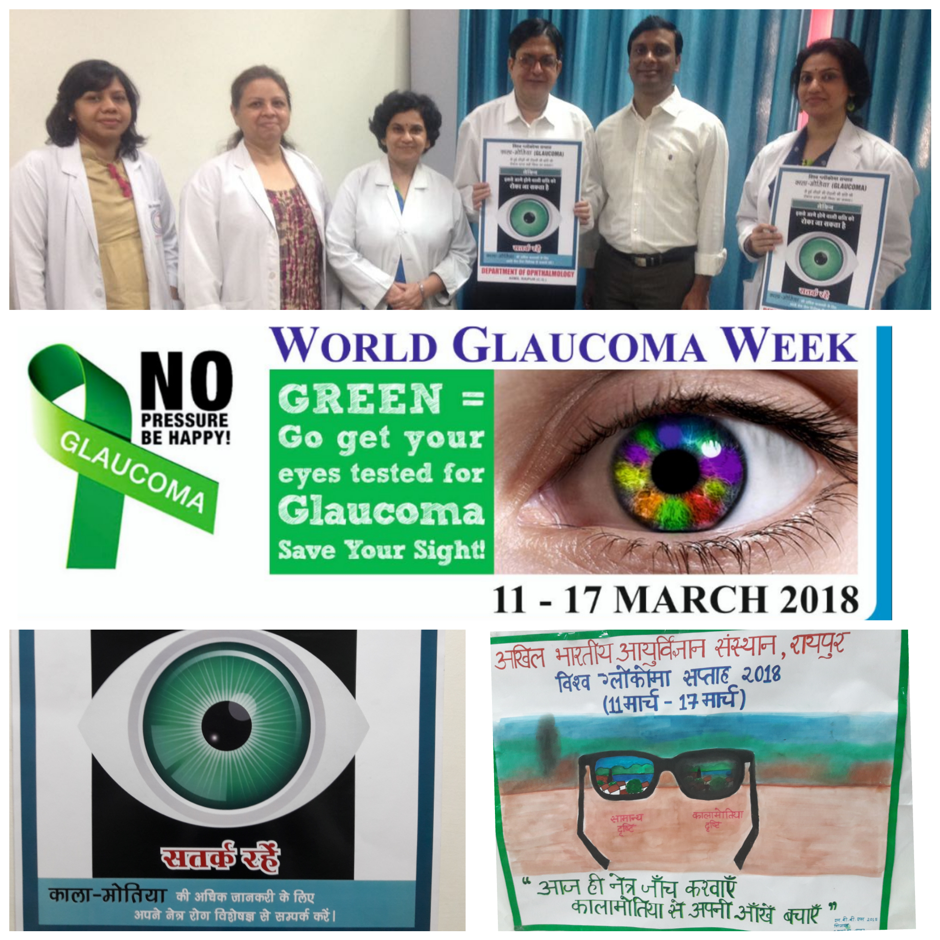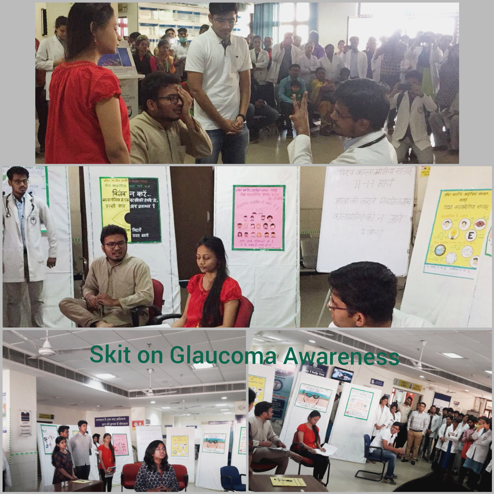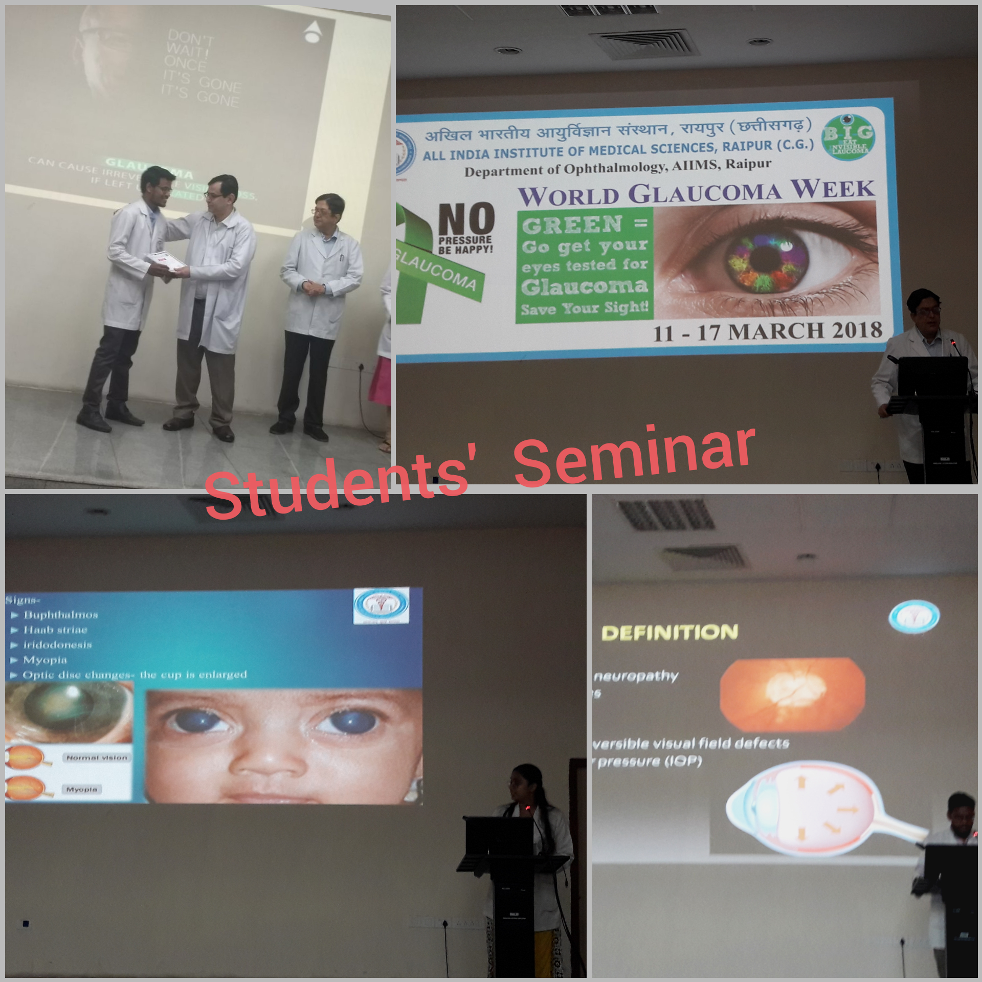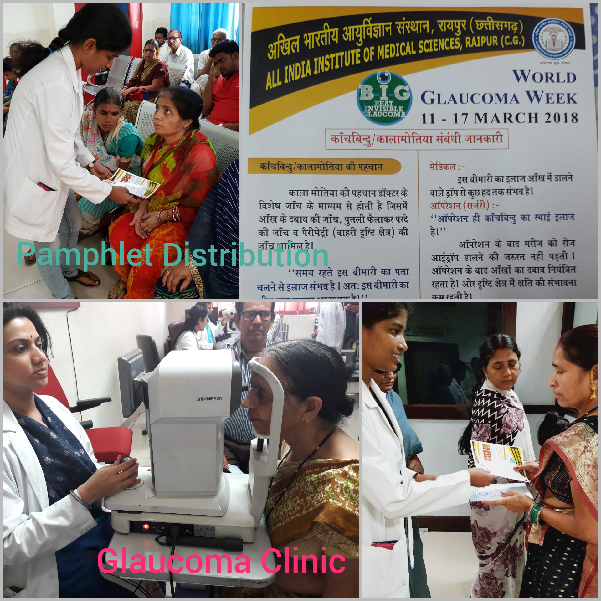 World Glaucoma Week was observed at AIIMS, Raipur from March 11th to 17th. This included MBBS Students activities in the form of Glaucoma seminar and Glaucoma education Posters. Skit performance for Glaucoma awareness was staged for the general public and patients. Pamphlets on Glaucoma information were handed to patients in Ophthalmology OPD. Glaucoma screening and evaluation clinic was run for general patients and hospital staff. The proceedings were well attended and appreciated by the hospital faculties, MBBS and nursing students, medical residents, hospital staff and the patients.