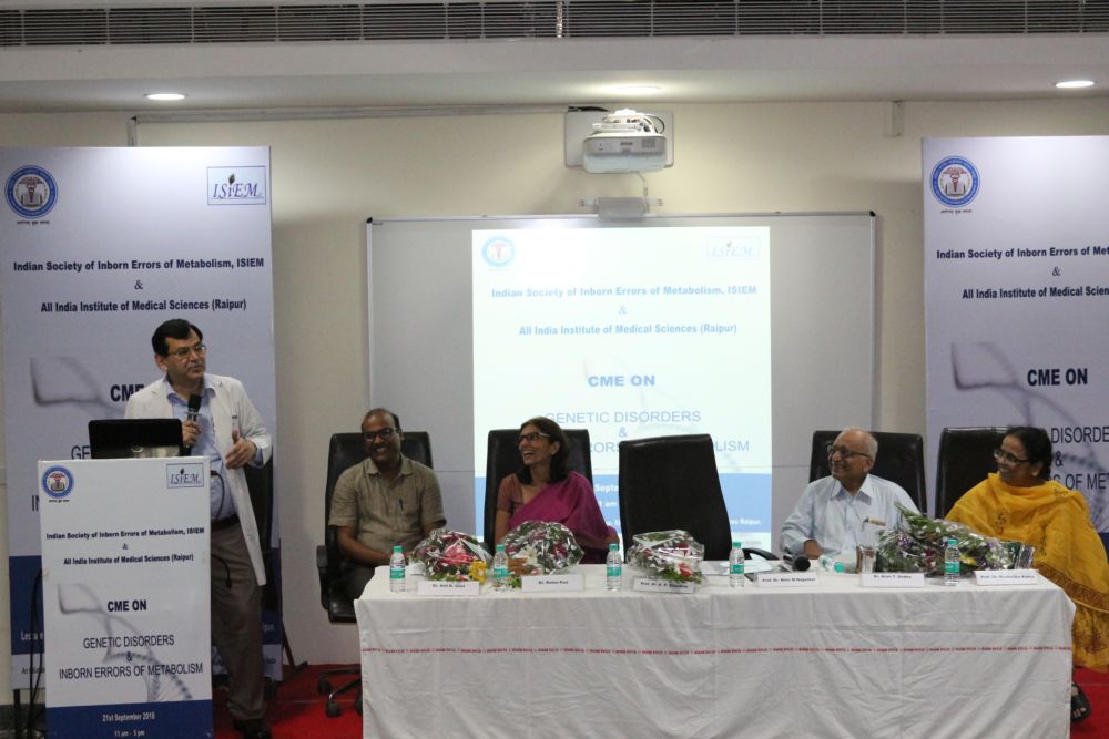 Report on CME on Genetic disorders and Inborn Errors of Metabolism:-The CME on Genetic Disorders and Inborn errors of Metabolism was organized by the Department of Pediatrics, AIIMS Raipur on 21st September 2018 in collaboration with Indian Society of Inborn errors of Metabolism. Well known researchers, Dr. Madhulika Kabra, Prof and In charge, Genetic Division, AIIMS Delhi, Dr. Ratna Puri, In charge of Genetics, SGRH Delhi, shared their knowledge and expertise in this CME with the pediatricians from in and around Raipur. Among others present were, Dr. Sanwar Agrawal, Director, Ekta Hospital, Raipur and Dr. Sharja Phuljhele, Prof and Head pediatrics, Pt. JNM Medical College, Raipur and Dr. Amar Singh Thakur, Deputy Director, Child Health, Chhattisgarh. Panel discussion and interactive sessions on various topics including, Genetics in Pediatric practice and approach to Intellectual Disability were discussed throughout the day.Hon. Director, AIIMS Raipur, Prof. (Dr.) Nitin M Nagarkar, (Chief Guest), Padmashree Dr. A. T. Dabke (guest of honor) graced the Inauguration ceremony.The organizing chairperson, Dr. Anil K. Goel, welcomed all dignitaries and delegates. Hon. Director Prof (Dr.) Nitin M Nagarkar in his address to the august gathering appreciated the efforts done by the organizing team and wished for success of the CME. He expressed confidence that with such academic activities and services AIIMS, Raipur would create a new benchmark in the health care services, not only in Chhattisgarh, but also in India. Members of the organizing committee were felicitated at the hands of Hon. Director. Dr. Atul Jindal, organizing Secy, proposed the vote of thanks.