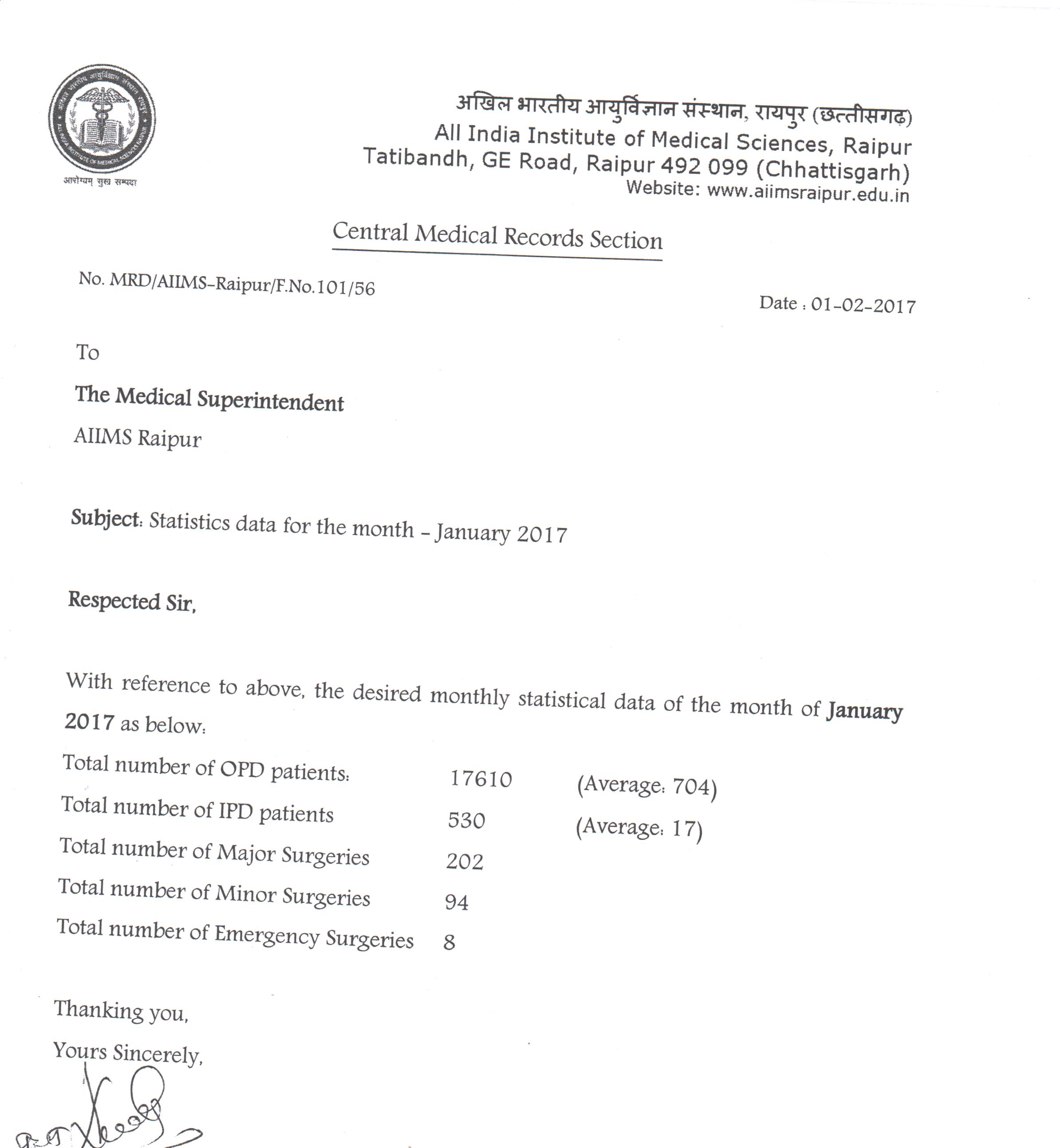| Sr. No | Month | Avg. OPD Attendance Per Day | Num of IPD Patient | Total Number of Surgeries Performed during the Month | Major Surgery, if any Performed, with brief details. | Any other Achievement which needs to be highlighted | Details |