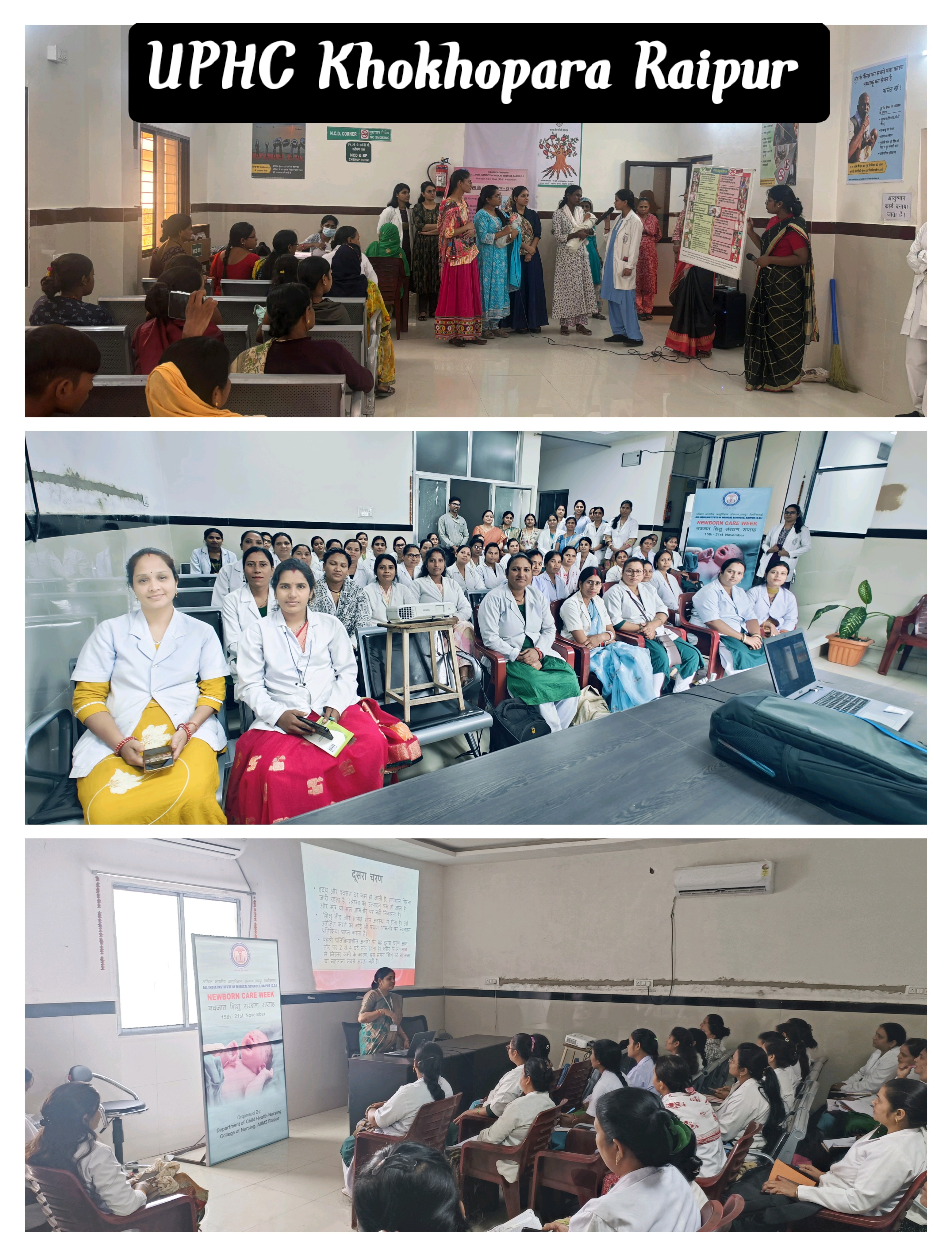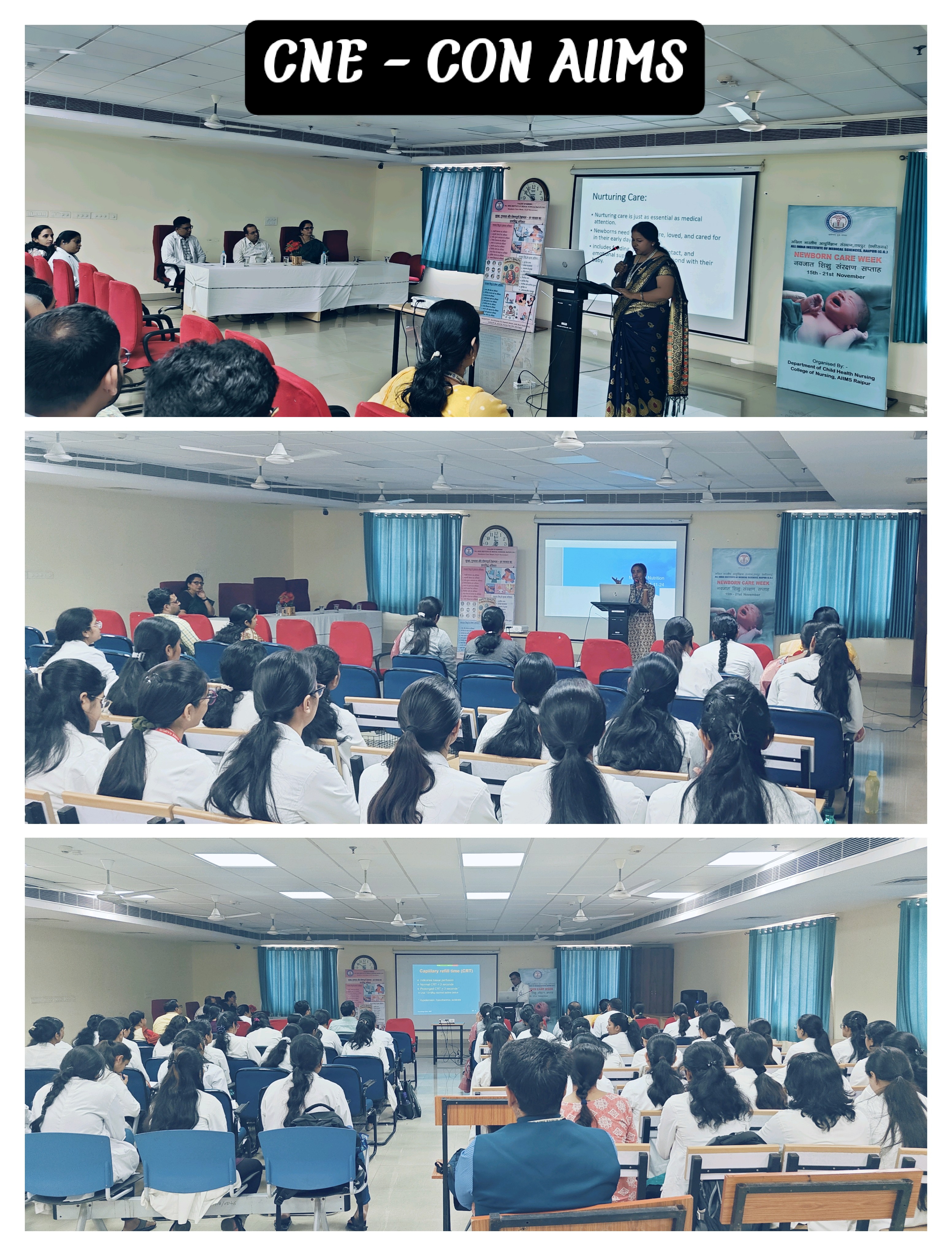 Organized By: Child Health Nursing Dept, College of Nursing Newborn Care Week was observed between 19 th to 21 st November 2024. The program was inaugurated on 19 th November 2024 by Prof (Dr.) Alok Chandra Agrawal, Dean Academics, in the presence of distinguished guest Dr. Renu Rajguru, Medical Superintendent, Dr. Binu Mathew Principal College of Nursing, Dr. Anil K Goel, HOD Pediatrics, Dr. Phalgun Padhi, Neonatologist. Public Education Poster presentation & Role play were carried out by students and faculty of college of Nursing AIIMS, Raipur On 20 th November 2024 Capacity building on Newborn care for ASHA ANMs was organized in Urban Primary Health Center, Khokhopara, Raipur. With this Public Education Poster presentation & Role play were also carried out by students and faculty of CON AIIMS, Raipur On 21 st November 2024 a CNE on the theme – “Safety, Quality & Nurturing Care- Birth Right of Every Newborn” was organized. The sessions were taken by Dr. Phalguni Padhi (Associate Professor), Dr. Rohit Anand (Assistant Professor) Dept of Neonatology, Dr. Nagma Nigar Shah IYCF Coordinator SCoEN AIIMS Raipur and Nursing faculty of Child Health Nursing Dept, CON AIIMS. Around 80 students of CON AIIMS offline and 172 students with 21 Nursing faculty from Shri Shankaracharya CON, Bhilai attended online. All the participants were provided with e-certificates too.