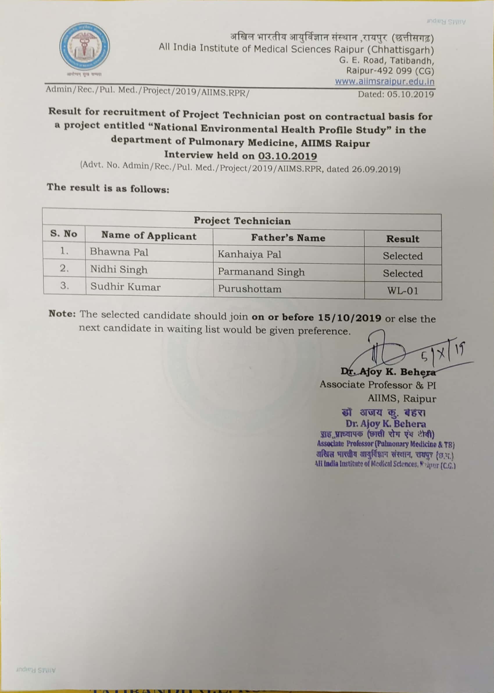 Result for recruitment of Project Technician post on contractual basis for a project entitled "National Environment Health Profile Study" in the department of Pulmonary Medicine,AIIMS,Raipur. Interview held on 03.10.2019(Advt No Admin./Rec./Pul.Med./Project/2019/AIIMS.RPR,dated 26.09.2019) |